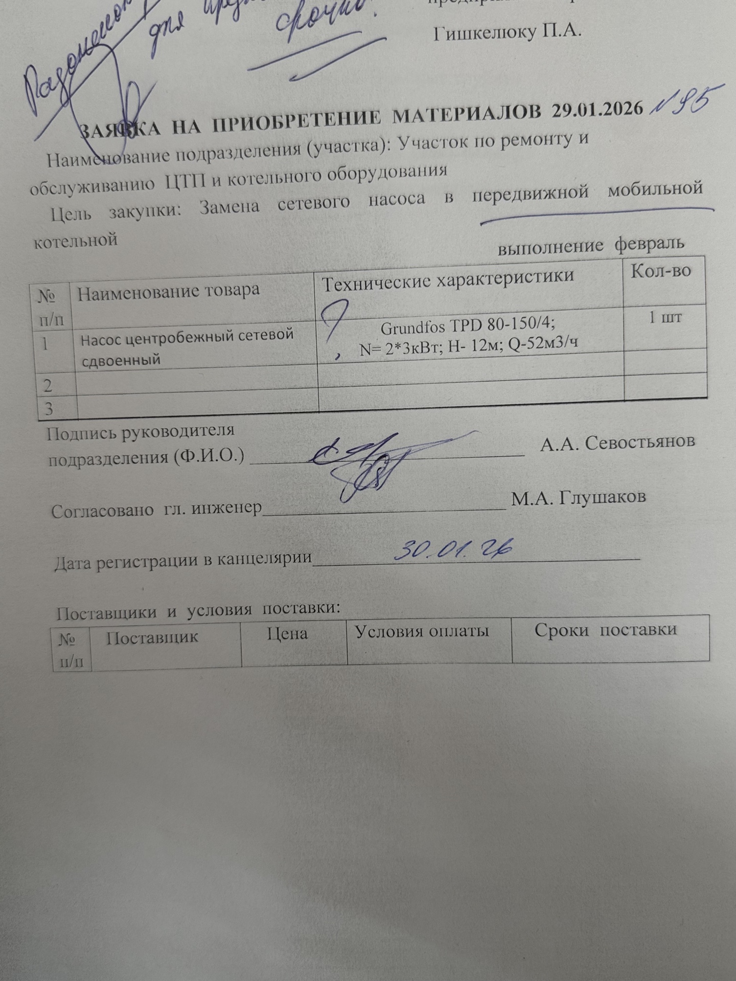 Клиент: Государственное предприятие «Оршатеплосети». По заявке на замену сетевого сдвоенного насоса для передвижной мобильной котельной требовалось срочно подобрать вариант на замену Grundfos TPD 80-150/4, N=2*3 кВт, H=12 м, Q=52 м3/ч. Клиент рассматривал аналоги только из наличия, без ожидания поставки.